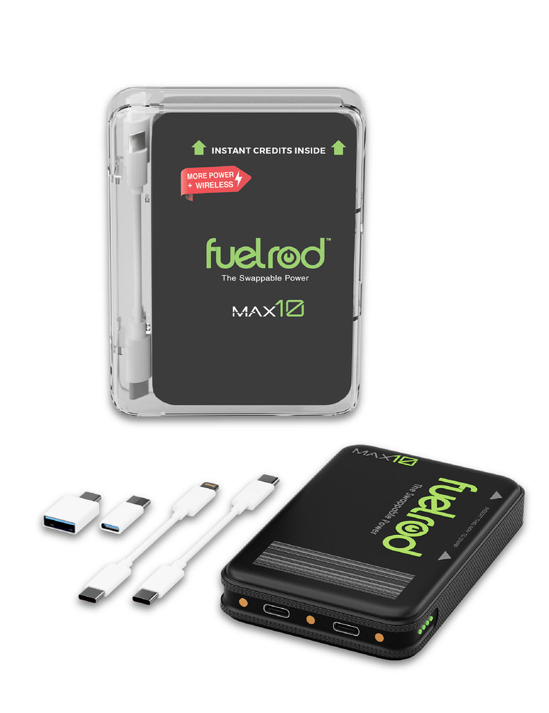 Learn HowREADY TO USE: The FuelRod MAX10 comes fully charged, complete with adapters and cables for most smart devices. Easily swap for a fresh, fully charged unit at any FuelRod Kiosk nationwide. Rechargeable via USB-C, it fits comfortably in your pocket, making it an ideal companion for any trip or staying charged on the go!