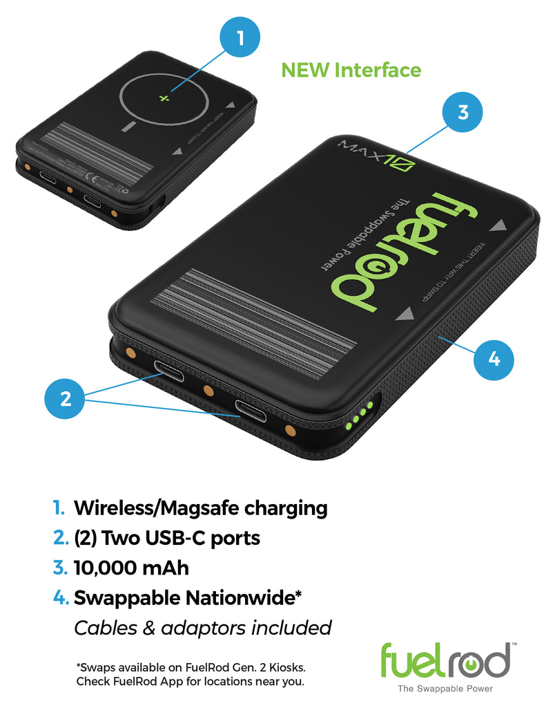 Best of all, it’s swappable for a fresh, fully charged one! If your MAX10 is depleted or damaged, you can easily swap it out at any FuelRod Gen. 2 kiosk. Its sleek, portable design makes it perfect for on-the-go charging.